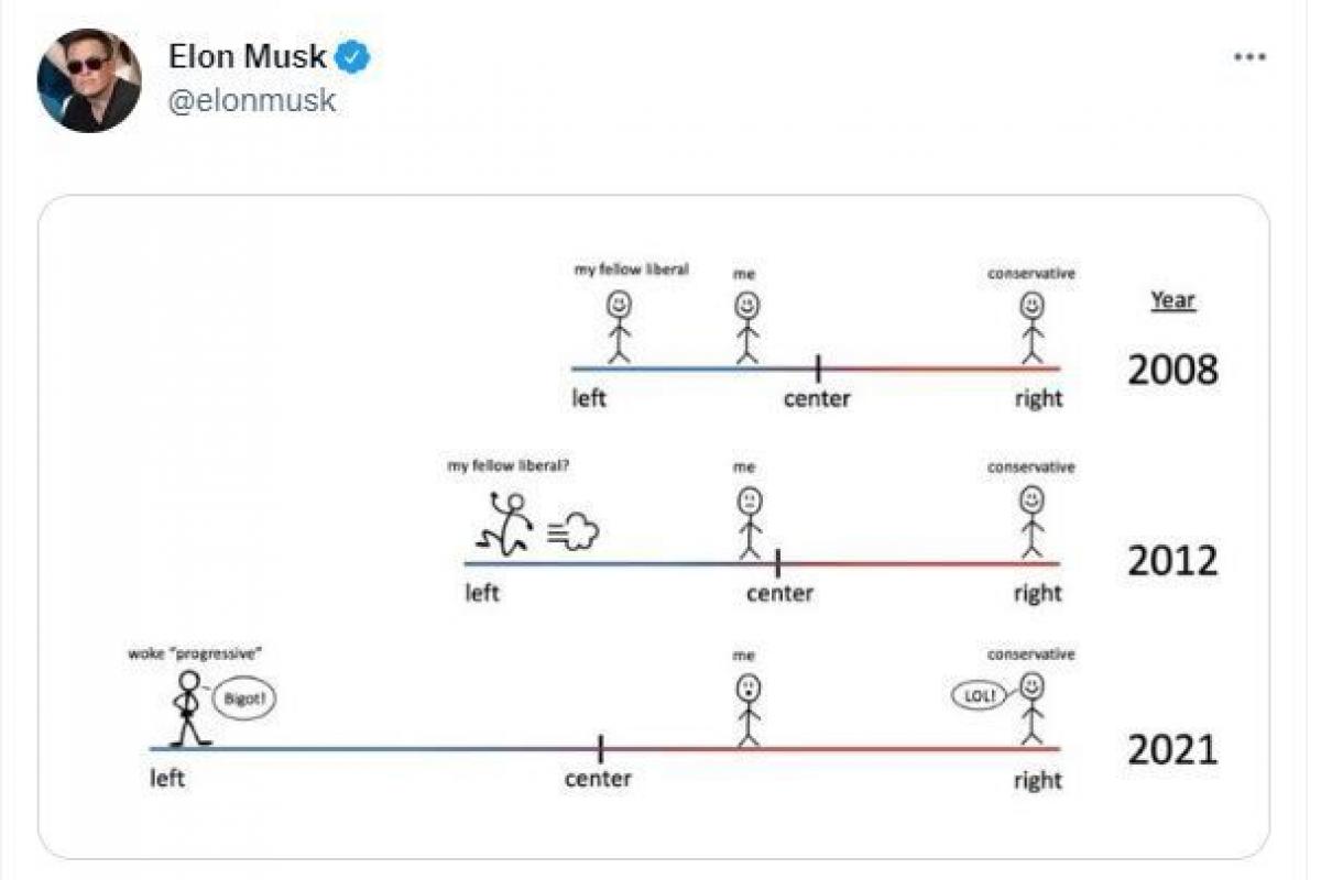Resumiendo mucho, en las imágenes se da a entender que la izquierda política se ha radicalizado tanto que ha hecho que el centro se perciba cada vez como una posición situada más a la derecha.