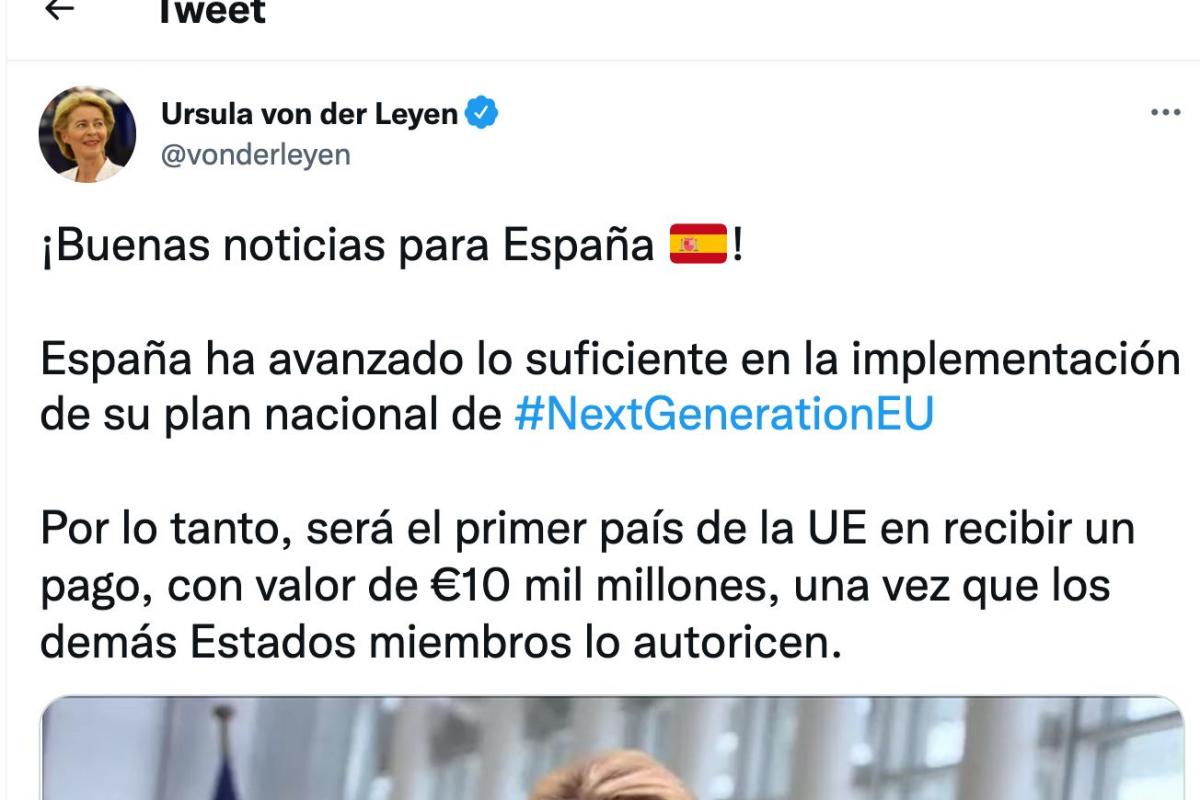 ″¡Buenas noticias para España 🇪🇸! España ha avanzado lo suficiente en la implementación de su plan nacional de #NextGenerationEU Por lo tanto, será el primer país de la UE en recibir un pago, con valor de €10 mil millones, una vez que los demás Estados miembros lo autoricen”, ha escrito von der Leyen en Twitter. Un mensaje que tiene más de 3.700 compartidos y más de 5.400 ‘me gusta’.