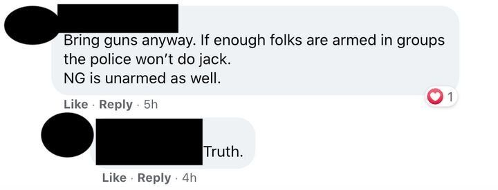 “Traed las armas. Si hay suficiente gente armada en grupos, la policía no hará nada. La Guardia Nacional tampoco va armada”, escribía un usuario, tal y como recoge Media Matters (en la imagen superior). A lo que otro contestaba: “Es verdad”.