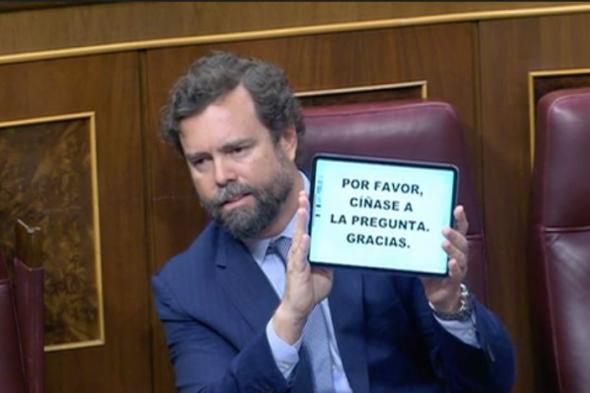 Durante la alocución de la ministra portavoz, Espinosa de los Monteros ha reciclado la imagen que ya mostró en su tablet hace una semana en una situación similar y en la que se podía leer “Cíñase a la pregunta. Gracias”.