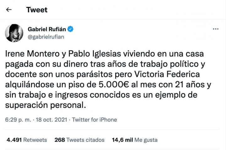 Sobre esto se ha pronunciado de manera rotunda Gabriel Rufián en Twitter: “Irene Montero y Pablo Iglesias viviendo en una casa pagada con su dinero tras años de trabajo político y docente son unos parásitos pero Victoria Federica alquilándose un piso de 5.000€ al mes con 21 años y sin trabajo e ingresos conocidos es un ejemplo de superación personal”.
