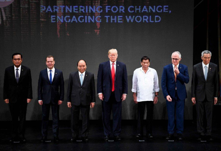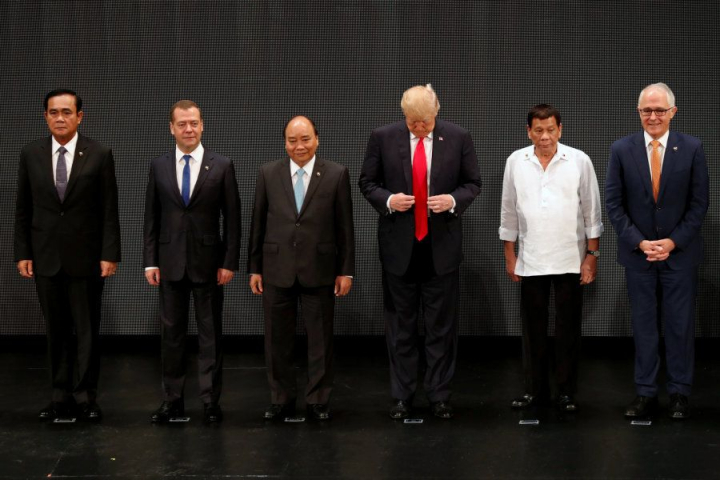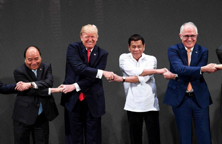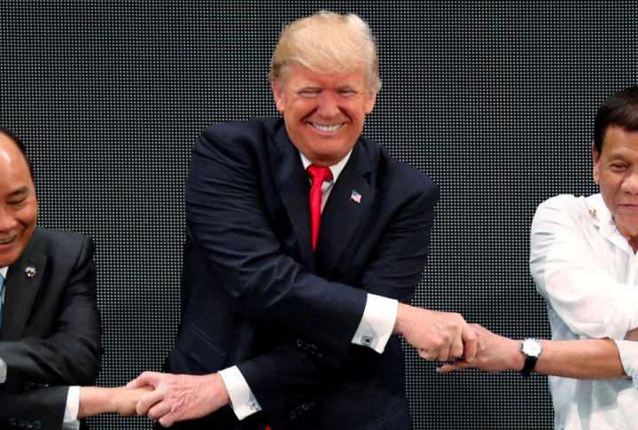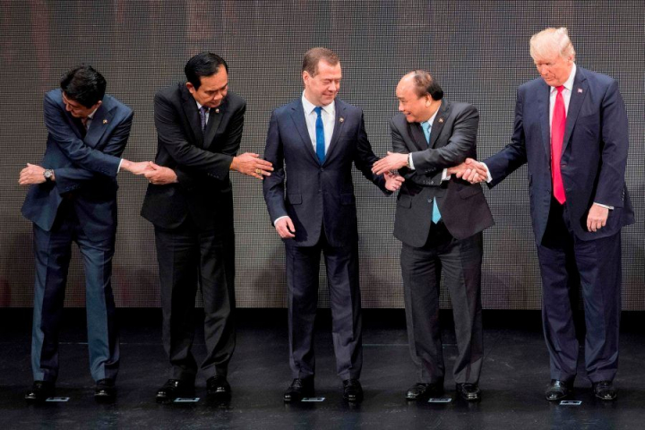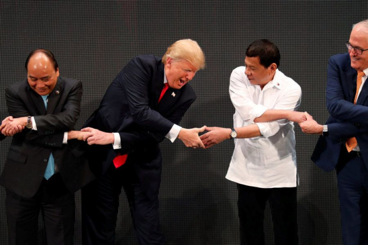 El momentazo ha tenido lugar en Manila, donde Trump ha asistido a las ceremonias de apertura de la conferencia de la Asociación para las Naciones del Sudeste Asiático (AESAN), que ha comenzado con una foto grupal de los líderes. Es en ese momento en el que se hace "el tradicional" apretón de manos, que consiste en que cada líder extiende su brazo derecho sobre su izquierda y sacude las manos opuestas de los que están a su lado. Esto al presidente le ha costado. Y mucho.