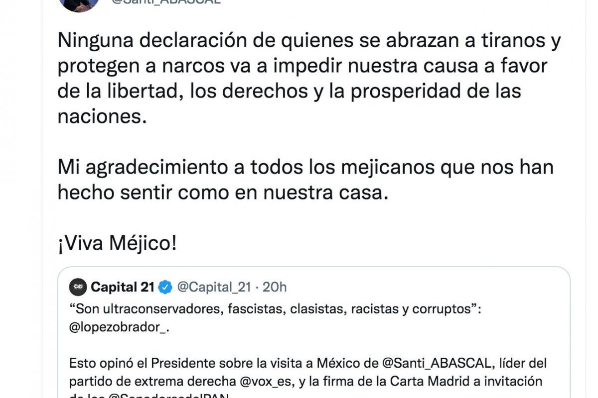 El líder de la formación de ultraderecha Vox, Santiago Abascal, ha contestado desde su cuenta de Twitter a las palabras del presidente de México, Andres Manuel López Obrador, que tildó a su formación política de “casi fascistas”, “retoño del franquismo” y se refirió a sus miembros como “autoritarios, clasistas, racistas, corruptos”.