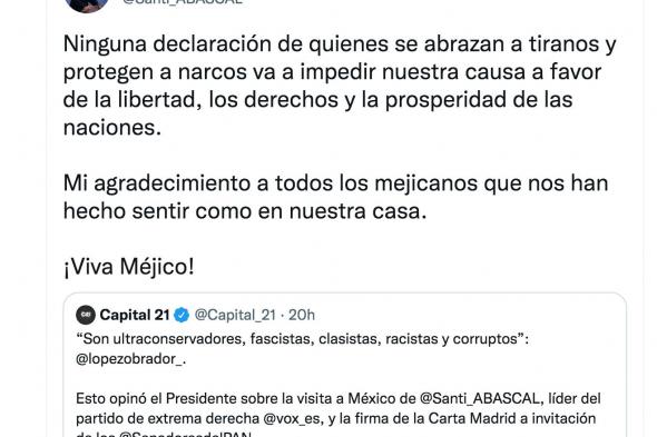 El líder ultra ha contestado con este tuit cargando contra el presidente mexicano, aunque sin nombrarlo: “Ninguna declaración de quienes se abrazan a tiranos y protegen a narcos va a impedir nuestra causa a favor de la libertad, los derechos y la prosperidad de las naciones. Mi agradecimiento a todos los mejicanos que nos han hecho sentir como en nuestra casa. ¡Viva Méjico!”.
