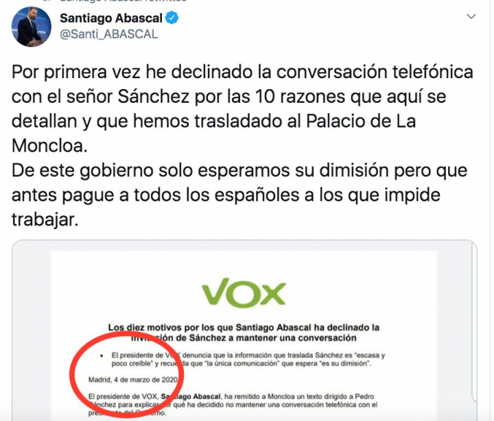Porque, una de dos, o Abascal guardaba ese documento desde hace un mes, o alguien todavía no se ha enterado de que estamos en abril, ya que el documento está fechado el 4 de marzo.