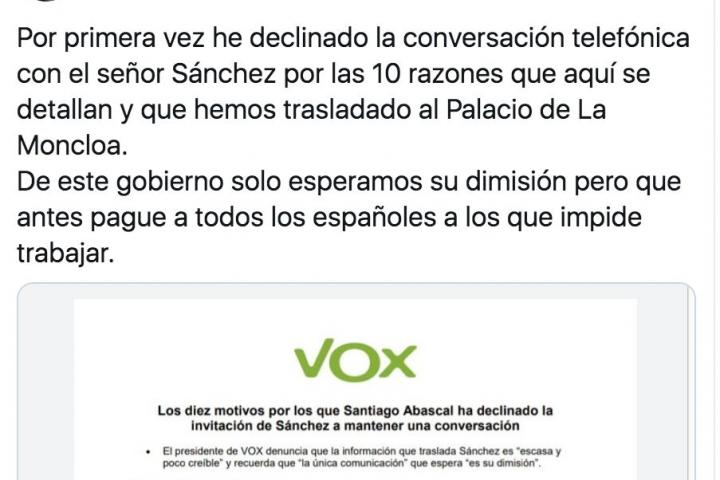 El líder del partido ultraderechista Vox, Santiago Abascal, ha compartido en su cuenta de Twitter un documento con lo que ha denominado “razones” para no coger el teléfono al presidente del Gobierno, Pedro Sánchez, para hablar sobre la crisis sanitaria derivada del coronavirus.