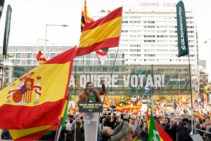 El líder de Vox, Santiago Abascal, y otras 24.999 personas, según Delegación de Gobierno, se han manifestado este domingo en el centro de Madrid en el acto organizado por la formación ultraderechista y el sindicato Solidaridad contra el Ejecutivo central.