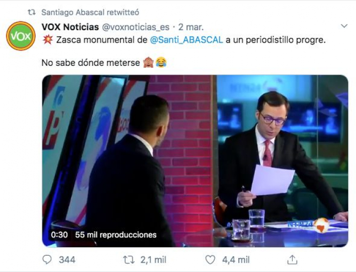 Sin embargo, el líder ultraderechista ha preferido vender en su cuenta de Twitter este momento como si fuera una victoria y ha retuiteado un mensaje en el que se asegura que fue él quien dio un “zasca” al periodista. Eso sí, el tuit incluye un vídeo con la entrevista sesgada y sólo incluye una de las respuestas del periodista.