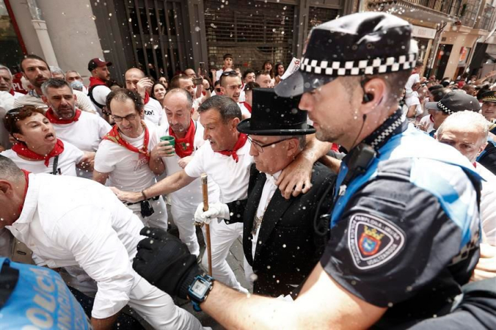 Numerosos miembros de la izquierda abertzale han agredido este jueves al alcalde y varios concejales de Pamplona y han herido a tres policías en los disturbios ocurridos durante la procesión de San Fermín.