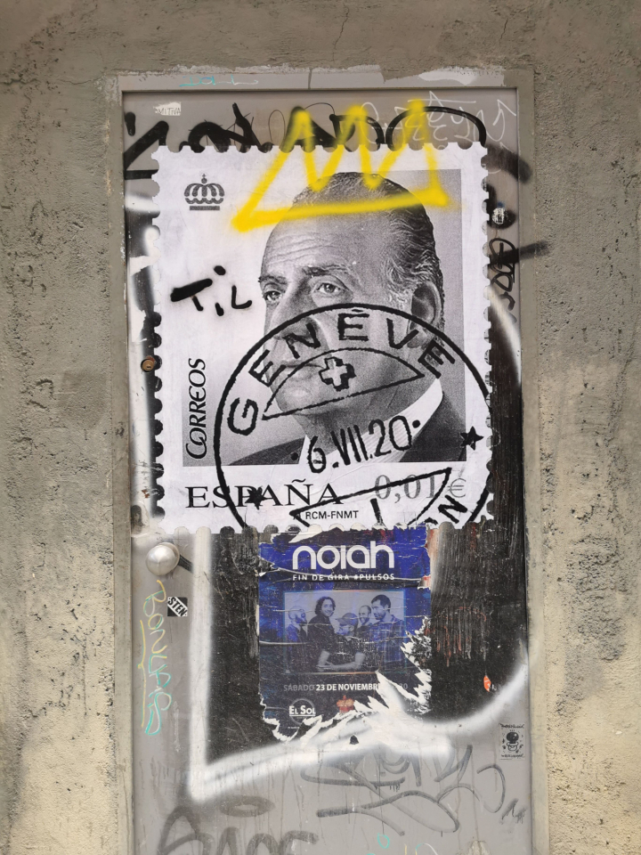 Cogió dos sellos del monarca, uno con una imagen suya más de joven y otra más actual, y les puso el matasellos de Ginebra a fecha de 6 de julio del 2020. “Denunciaban la pérdida de credibilidad y valor de su figura a través de la metáfora del sello matasellados, ya que cuando se le pone al sello un matasellos, éste pierde su valor”, asevera Calero.