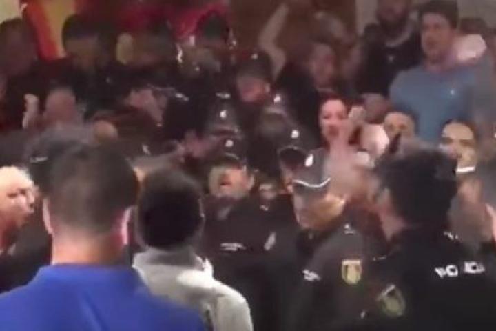 Durante la concentración en Pineda de Mar se vivieron momentos de tensión, especialmente cuando los Mossos hicieron un pasillo para que entrara un grupo de policías nacionales, que fueron recibidos por sus compañeros ya instalados en el interior del hotel con gritos de "Viva España" y "Que nos dejen actuar".
