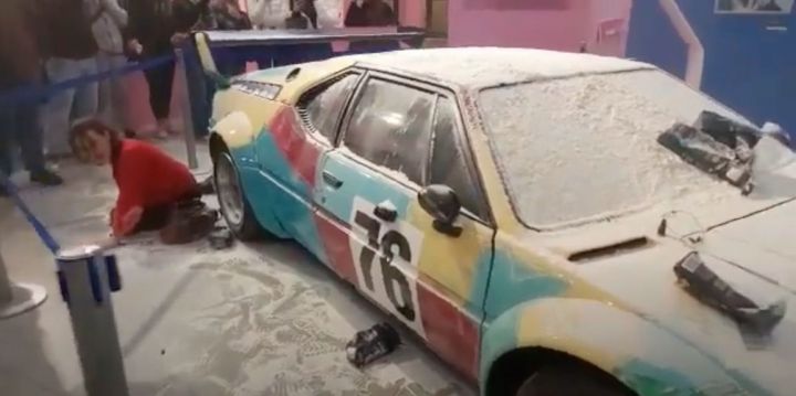 Los activistas saltaron el cordón que protegía la obra y arrojaron sacos de harina hasta cubrir por totalidad el coche customizado por Warhol, mientras gritaban consignas como “hace falta ocuparse de esto” y “es una cuestión de bien común”, según puede apreciarse en un vídeo publicado por el diario especializado en arte Artribune.