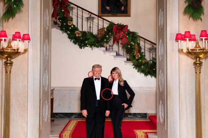 Pero ahora las críticas se han centrado en varios aparentes errores de Photoshop que tiene la foto. Los ‘detectives’ de Twitter aseguran en primer lugar que no hay contacto entre el brazo de Trump y la chaqueta de Melania. ¿Dónde está el VAR cuándo se le necesita?