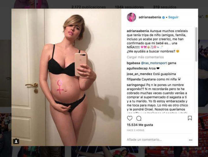 La presentadora Adriana Abenia ha publicado en Instagram —donde tiene casi 200.000 seguidores— que está embarazada de una niña.