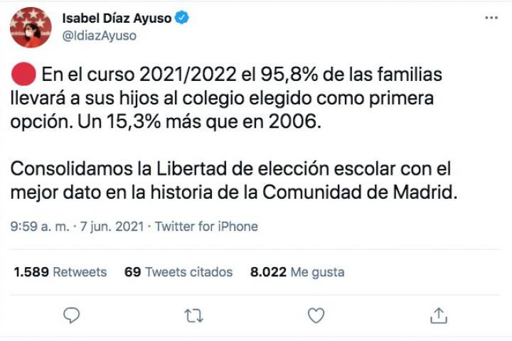 “En el curso 2021/2022 el 95,8% de las familias llevará a sus hijos al colegio elegido como primera opción. Un 15,3% más que en 2006. Consolidamos la Libertad de elección escolar con el mejor dato en la historia de la Comunidad de Madrid”, ha escrito Ayuso.
