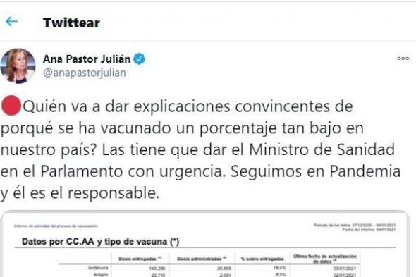 ″¿Quién va a dar explicaciones convincentes de por qué se ha vacunado un porcentaje tan bajo en nuestro país? Las tiene que dar el Ministro de Sanidad en el Parlamento con urgencia. Seguimos en Pandemia y él es el responsable”, escribió Pastor.