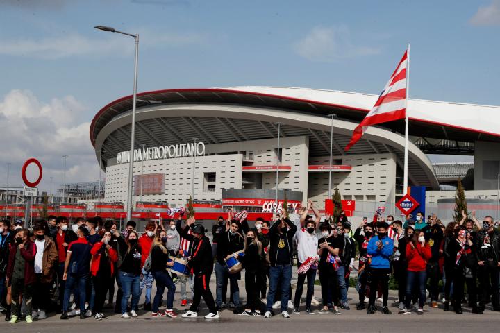 Horas después de que el Tribunal Superior de Justicia de Madrid suspendiera definitivamente las manifestaciones por el 8-M, Día Internacional de la Mujer, en los alrededores del estadio Wanda Metropolitano centenares de aficionados del Atlético de Madrid se han reunido para apoyar a su equipo antes del derbi ante el Real Madrid, que se juega este domingo.