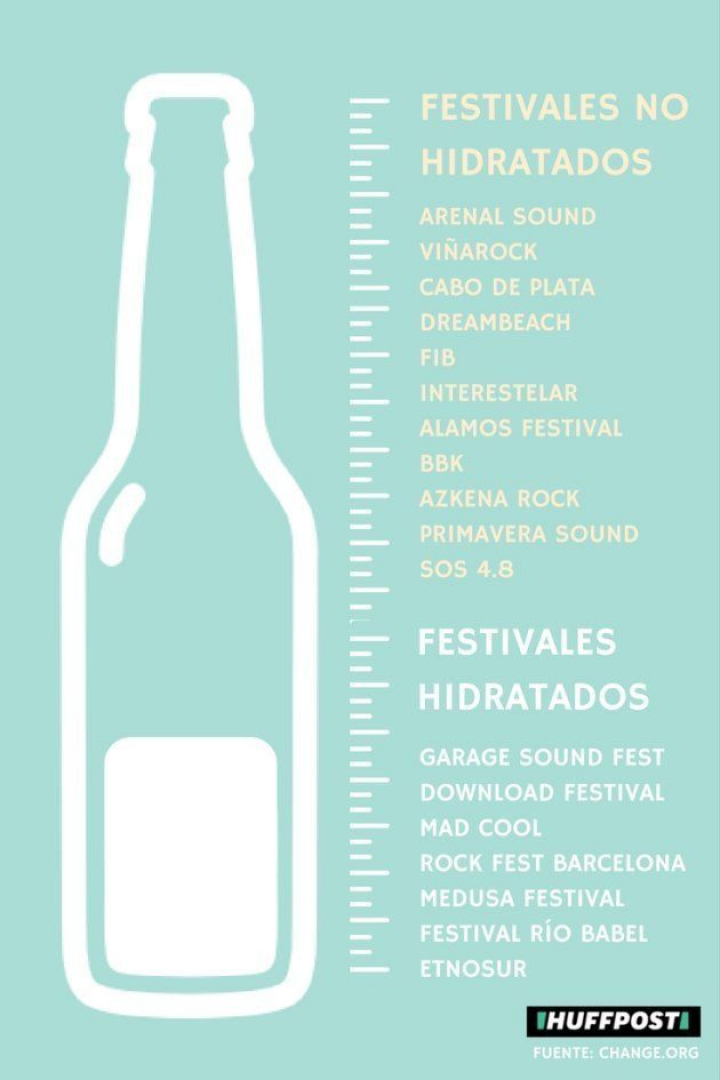 A los nombres proporcionados por el propio Artacho (Garage Sound Fest, Download Festival, Mad Cool, Rock Fest Barcelona, Medusa Festival, Festival Río Babel y Etnosur), hay que sumarles otros como el Rototom Sunsplash (Benicasim) y el Sónar (Barcelona), donde sí permiten el acceso a agua potable. O el Marea Rock (Elche), donde según su web se puede acceder con las botellas de agua precintadas.