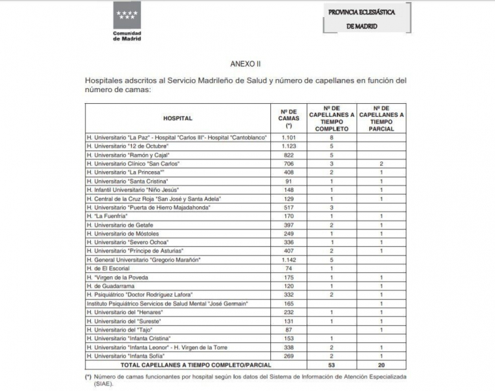 Rastreadores no demasiados, pero capellanes que no falten. La Comunidad de Madrid ha publicado en su Boletín Oficial el convenio con la Provincia Eclesiástica de Madrid para la asistencia religiosa católica en los centros hospitalarios.