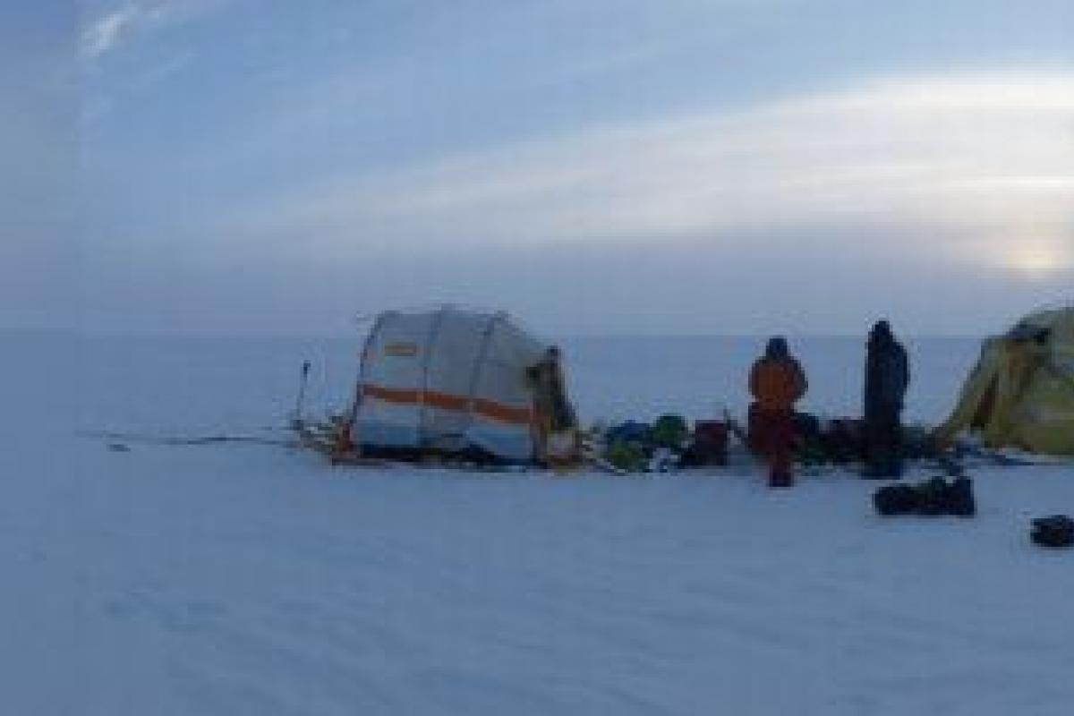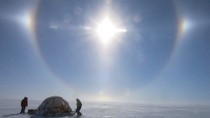 Alguien podría pensar que el paisaje es monótono, uniforme, aburrido. Nada más lejos de la realidad. En este lugar donde nunca en estos días se pone el Sol, la luz al atardecer, reflejada en el hielo, genera fenómenos ópticos espectaculares, como el parhelio que vimos el otro día que consiste en la visión de tres soles simétricos en el horizonte. De cuando en cuando también recibimos la visita de una gaviota despistada que pasa con nosotros unas horas antes de iniciar la vuelta a la costa; o eso queremos pensar, que no se pierde.