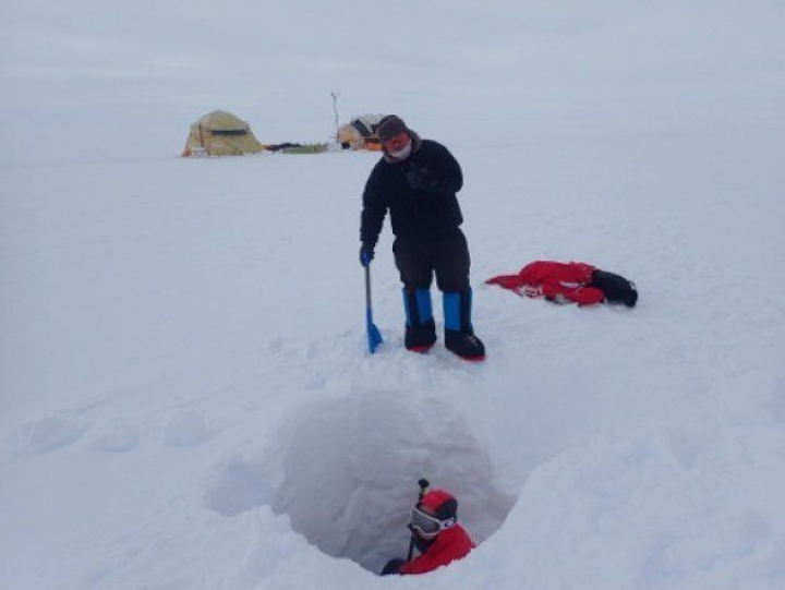 Para hacer los agujeros que se necesitan es importante situarnos lo más cerca posible de los puntos en los que hace unos años se hicieron otros similares a los que hacemos ahora. Se trata de poder comparar luego los datos. Llevamos ya una docena de ellos y, según nos explica Ross Edwards, nuestro científico a bordo, en los dos metros y medio profundidad de cada uno recoge información de la nieve caída en los últimos 12 años, además de otros datos. Es una perforación que nos lleva al pasado.