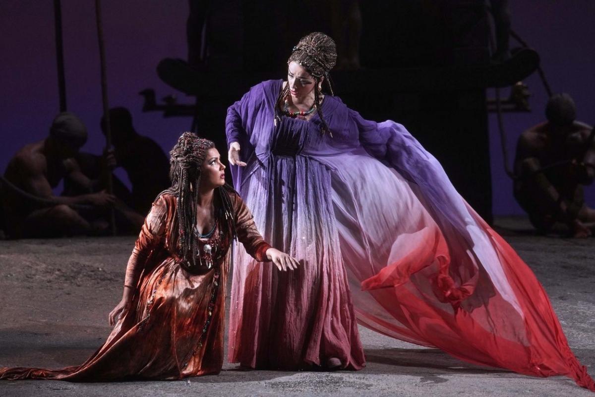 A la que sigue todo el vestuario. Bonito hasta para los ballets y figurantes que van en taparrabos. Aunque nada como los vestidos de la soprano, Aida, y de la mezzosoprano, la princesa Amneris. A la que se viste túnicas coloridas y tocados, como le corresponden a la heredera al trono de Egipto que es. Rivales por el amor de Radamés, el gran guerrero egipcio. La primera, correspondida, a pesar de ser esclava de guerra y enemiga, y la segunda, sin éxito, por lo que sufre, se enfada, busca venganza.