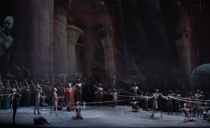 Personajes a los que se añaden cienes y cienes de personas en el escenario. Desde luego, muchísimas más de las que se suele ver en un escenario hoy en día. Y es que hay que poner en escena ejércitos, servicio, corte real, pueblos enemigos, el boato religioso y sus procesiones, grandes templos llenos de fieles y sacerdotes. Representar, en definitiva, una corte rica y dorada como la que ocupa el imaginario colectivo gracias al cine de Hollywood, Cleopatra y la citada tumba de Tutankamón y, en España, a las novelas y la afición del escritor Terenci Moix, un novelista hoy olvidado al menos a nivel popular.
