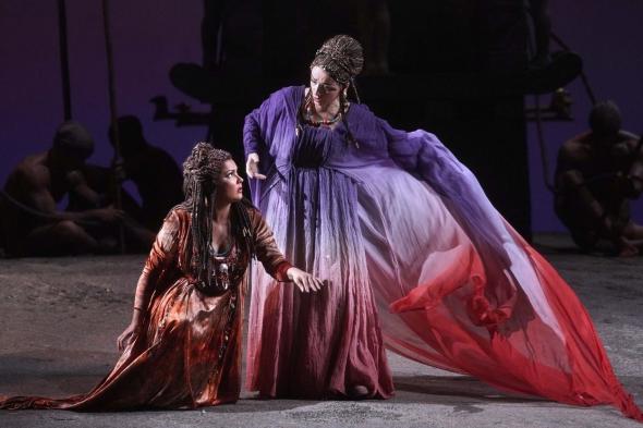 A la que sigue todo el vestuario. Bonito hasta para los ballets y figurantes que van en taparrabos. Aunque nada como los vestidos de la soprano, Aida, y de la mezzosoprano, la princesa Amneris. A la que se viste túnicas coloridas y tocados, como le corresponden a la heredera al trono de Egipto que es. Rivales por el amor de Radamés, el gran guerrero egipcio. La primera, correspondida, a pesar de ser esclava de guerra y enemiga, y la segunda, sin éxito, por lo que sufre, se enfada, busca venganza.