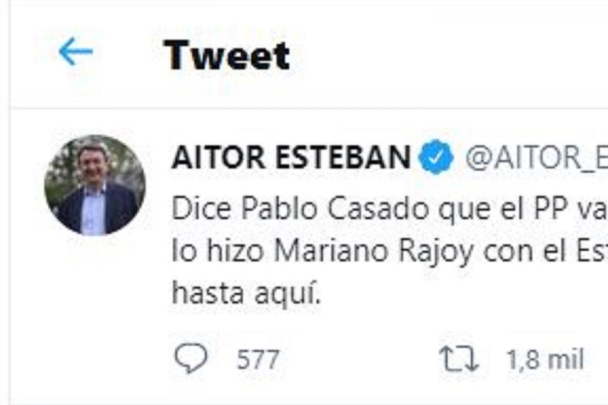 Y poco después de conocerse la noticia, el portavoz del PNV en el Congreso, Aitor Esteban, ha publicado un tuit que ha tenido un gran éxito en la red social, con más de 6.000 ‘me gusta’ en tres horas.