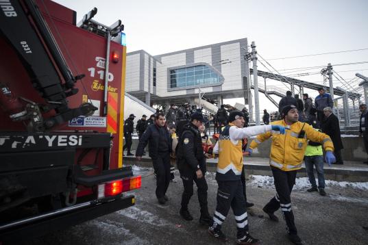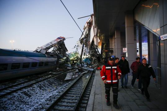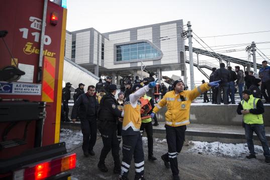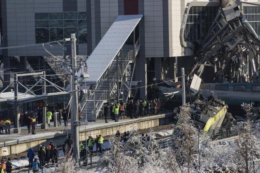 ANKARA, TURKEY - DECEMBER 13 : Rescue workers are seen at the station after high-speed train crashed in Turkish capital Ankara on December 13, 2018. (Photo by Dogukan Keskinkilic/Anadolu Agency/Getty Images)