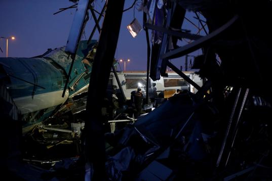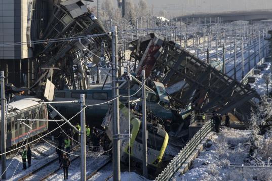 ANKARA, TURKEY - DECEMBER 13 : A view of the crash site where a high-speed train crashed into a pilot engine traveling along the same rails in Turkish capital Ankara on December 13, 2018. After the crash an overpass also collapsed onto some of t...