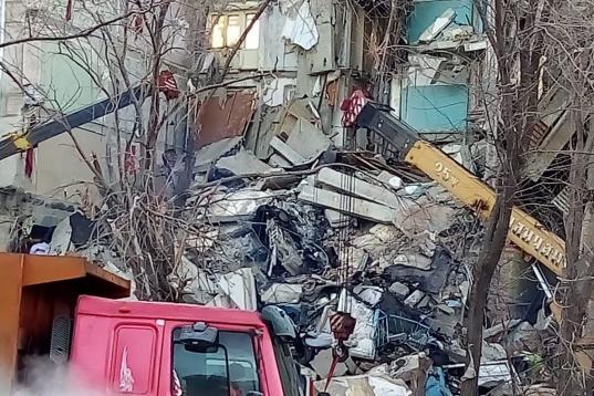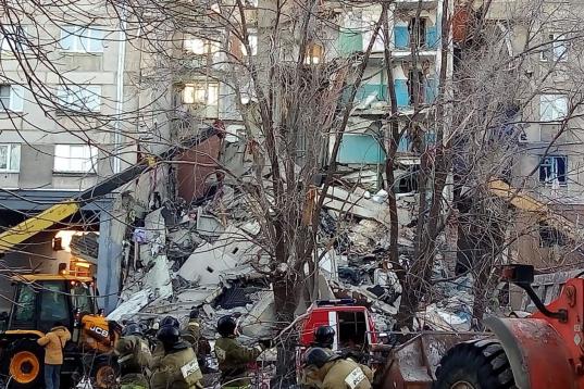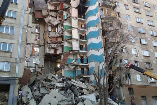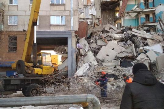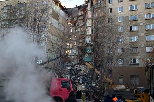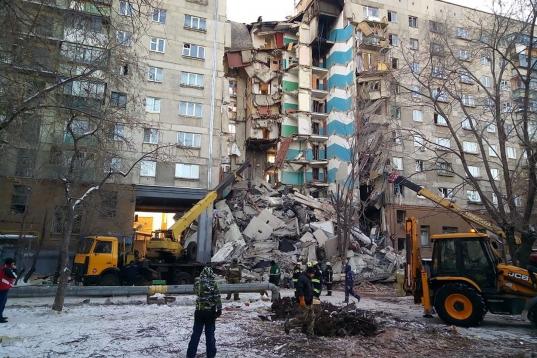 MAGNITOGORSK, RUSSIA - DECEMBER 31, 2018: Clearing the debris at the site of an apartment building collapse. A suspected domestic gas blast caused a partial collapse of a residential building at 164 Karla Marksa Prospekt Street killing three peo...