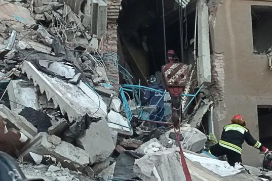 MAGNITOGORSK, RUSSIA - DECEMBER 31, 2018: Russian Emergency Situations Ministry employees at the site of an apartment building collapse. A suspected domestic gas blast caused a partial collapse of a residential building at 164 Karla Marksa Prosp...