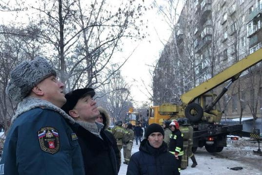 MAGNITOGORSK, RUSSIA - DECEMBER 31, 2018: Chelyabinsk Region Governor Boris Dubrovsky (2nd L) talks to Russian Emergency Situations Ministry employees at the site of an apartment building collapse. A suspected domestic gas blast caused a partial...