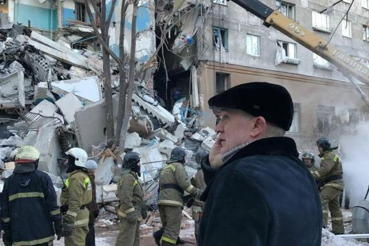 MAGNITOGORSK, RUSSIA - DECEMBER 31, 2018: Chelyabinsk Region Governor Boris Dubrovsky at the site of an apartment building collapse. A suspected domestic gas blast caused a partial collapse of a residential building at 164 Karla Marksa Prospekt ...