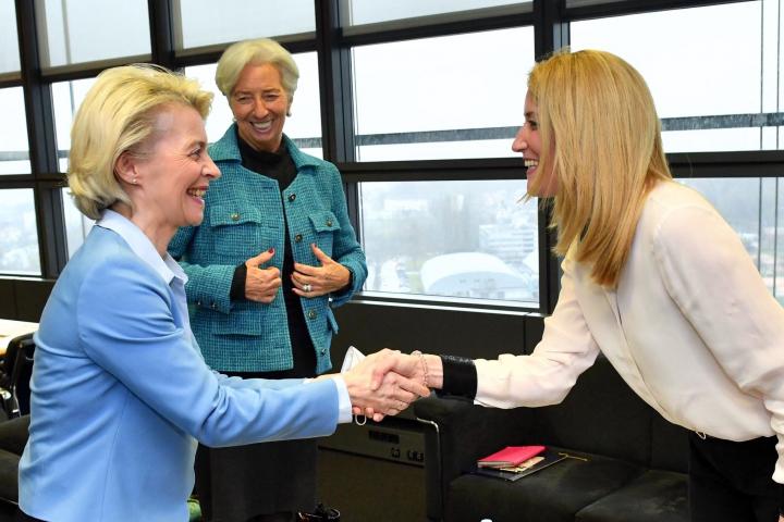 Von der Leyen, Lagarde y Metsola se encuentran por primera vez, una potente imagen nunca antes registrada en los 'topjobs' de la cúpula comunitaria.