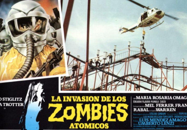 Pero si hay un caso paradigmático es el de la inefable coproducción, La invasión de los zombies atómicos, cuyo título italiano es más elocuente, Incubo, sulla città contaminata (algo así como “Pesadilla en la ciudad contaminada”), así como el título americano, Nightmare City, haciendo alusión a una ciudad de pesadilla. Pues bien, revisar esta película, no tiene desperdicio. Un avión repleto de infectados, aterriza en una base militar. Y para recrear la base militar se utiliza una española, mientras el avión es un Hércules de nuestra Fuerza Aérea. Pero, después, llega lo mejor. Los infectados, asesinos caníbales, que matan y contagian, llegan a la ciudad, que no es otra cosa que Madrid. Y así podemos ver cómo se vacían las calles, la estación de Chamartín, o la zona de Azca con la torre Windsor, y son tomadas por los infectados y por los militares. Cómo los zombies atacan un hospital, que en realidad es una de las residencias de mayores de la Comunidad de Madrid, cómo vagan por los campos del extrarradio, o cómo se refugian en el parque de atracciones, subidos a la montaña rusa Jet Star, para terminar siendo bombardeados desde un helicóptero por un Paco Rabal que interpreta a un militar de alta graduación… Como lo oyen.