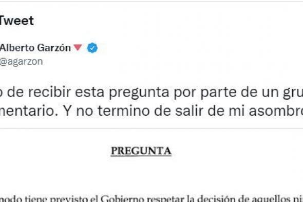 Alberto Garzón, ministro de Consumo, ha expresado en su tuit su perplejidad por la pregunta que le ha enviado un grupo parlamentario y que él mismo ha compartido en la red social.