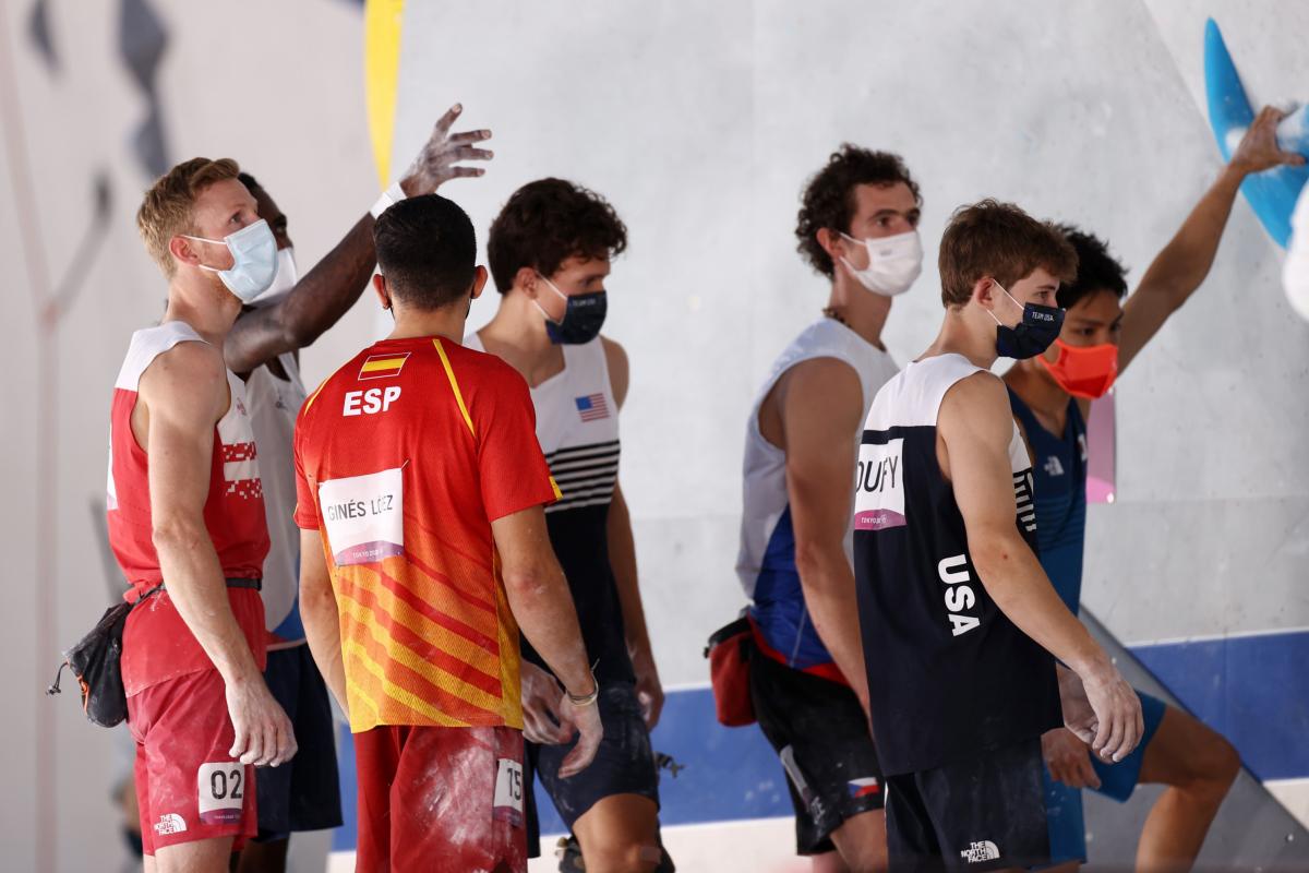Pero este jueves, en la final de la escalada masculina se ha ido un paso más allá. Entre la prueba de velocidad y la de bouldering o escalada de bloques los deportistas han dejado una imagen muy curiosa.
