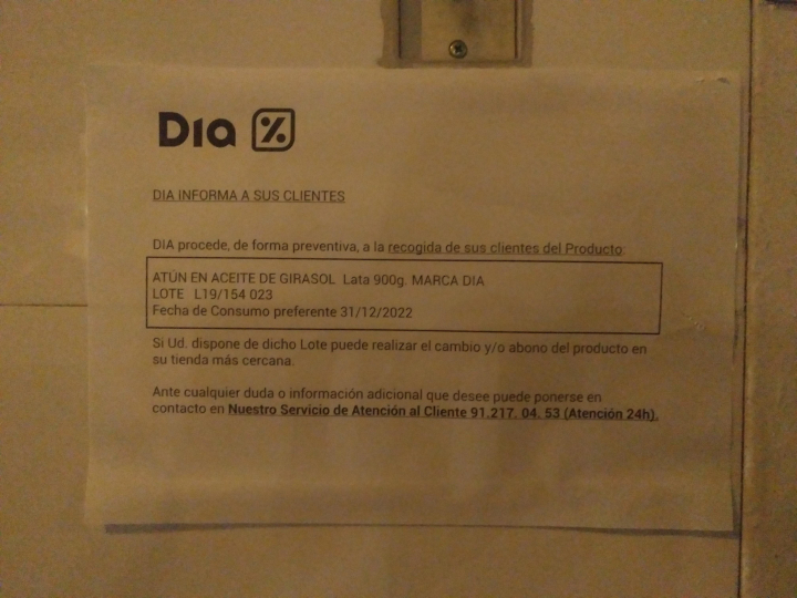 El producto implicado es una conserva de atún en aceite de girasol de 900 gramos, de la marca blanca de Dia, con número de lote 19/154 023 02587 y fecha de consumo preferente 31 de diciembre de 2022. Este producto fue elaborado por la empresa de conservas gallega Frinsa del Noroeste.