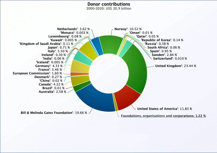Se estima que el apoyo inicial de la Fundación Bill y Melinda Gates fue de 750 millones de dólares, una cantidad que se amplía periódicamente, pero hay muchos más donantes. Según las cuentas de la entidad, el matrimonio ‘solo’ aporta un 19,6% de los fondos. En el listado oficial de donantes figuran el Banco Mundial, gobiernos nacionales como España y trasnacionales como la Comisión Europea, junto a entidades privadas entre los que se encuentran farmacéuticas ahora de plena actualidad como Janssen, Pfizer o Sanofi.