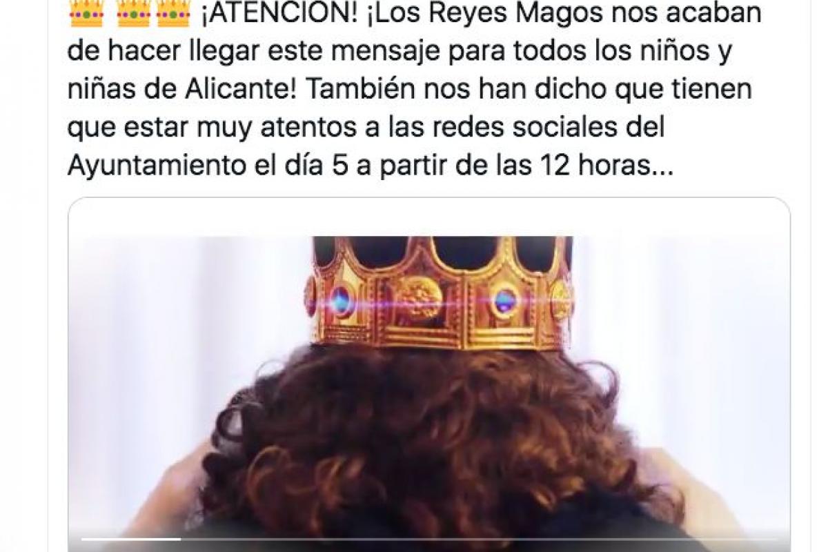 ″¡Atención!”, anuncia el tuit publicado por el Consistorio, que asegura haber recibido un “mensaje para todos los niños y niñas de Alicante” de sus majestades los Reyes Magos.