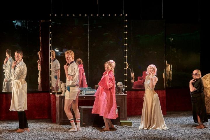 Todos ellos son unos esperpentos. Figuras deformadas por el espejo del teatro, como lo es Max Estrella en el Callejón del Gato en Luces de Bohemia de Valle Inclán. Como el público, los propios actores y personajes son deformados por esos grandes espejos que ocupan el fondo del escenario. En los que se miran y se maquillan como puertas y como payasos. En donde se ve reflejado el patio de butacas, los que pagan las entradas más caras.