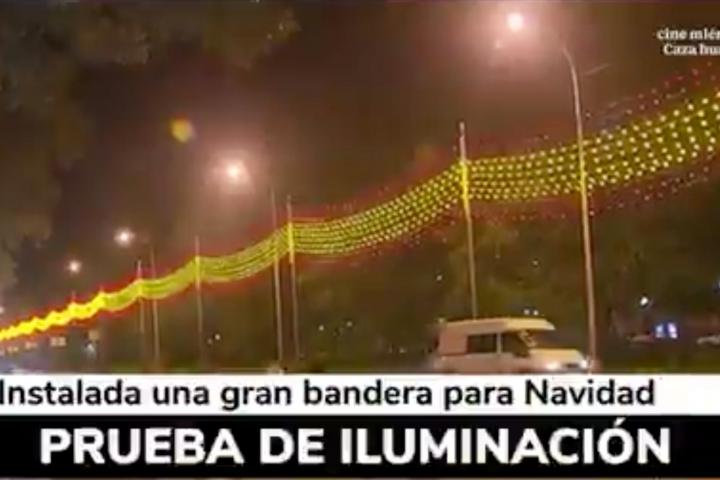 Almeida coloca una bandera gigante de España con luces de Navidad en pleno centro de Madrid