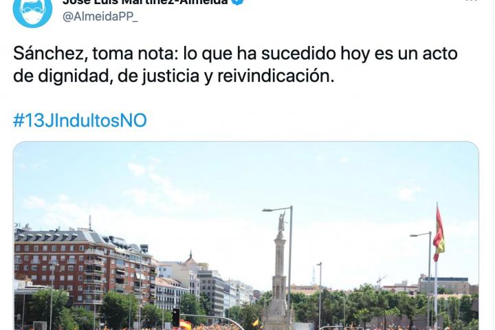 Este último está recibiendo críticas en Twitter por un tuit que puso en plena mañana tras ver la afluencia de personas que se habrían congregado en la conocida plaza ubicada en el centro de la capital. “Sánchez, toma nota: lo que ha sucedido hoy es un acto de dignidad, de justicia y reivindicación”, escribió Almeida adjuntando una fotografía.
