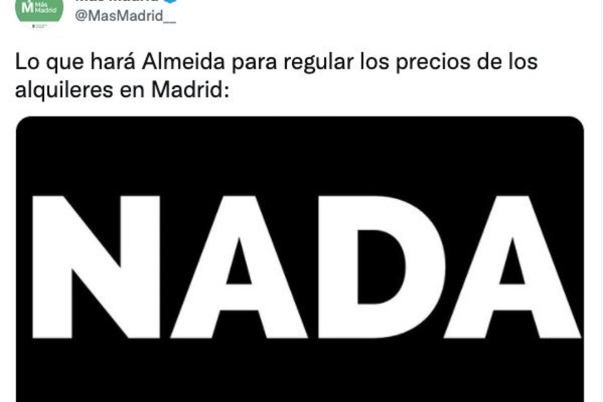 Tras ello, Más Madrid ha publicado un tuit en el que se puede leer: “Lo que hará Almeida para regular los precios de los alquileres en Madrid”. Y justo debajo una gran tarjeta en la que se lee con grandes letras la palabra “Nada”.