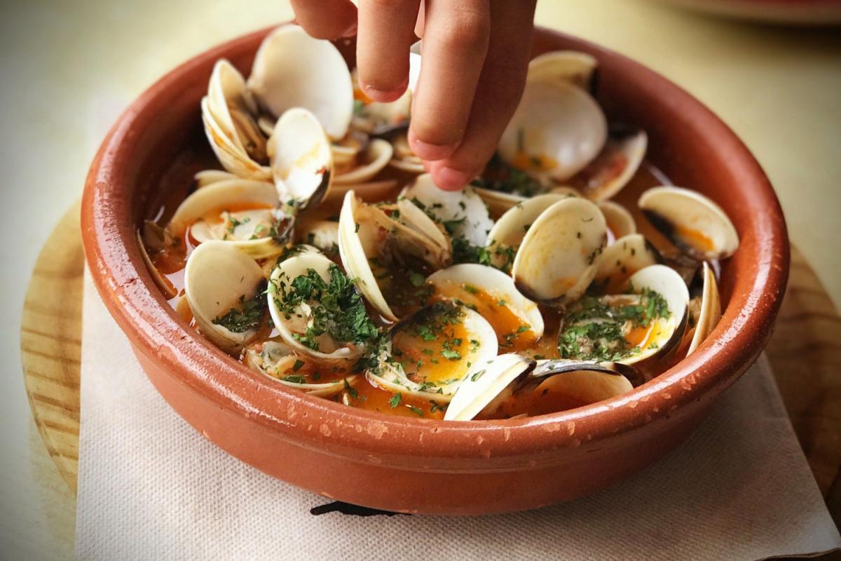 Picar el chorizo o la chistorra en brunoise. Poner una cazuela en el fuego con el aceite, rehogar el ajo en láminas, la guindilla y la cebolla y, cuando tomen color, añadir el chorizo o chistorra. Rehogar y dejar que se fría lentamente durante 8 minutos; será el momento de incorporar las almejas bien lavadas con cuidado de que ninguna tenga golpes ni arena. Rehogar con cariño y verter la manzanilla, dejar hervir 2 minutos e incorporar el caldo de pescado. Hervir durante 5 minutos, salpimentar y espolvorear con el perejil y remover la cazuela. Servir en la misma cazuela.