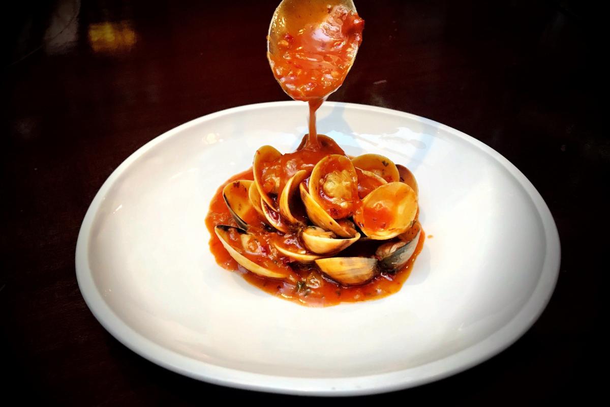 En una sauter grande, calentar el aceite, añadir el ajo laminado y cuando tome color dorado, añadir el pepperoncino. Verter el vino y las almejas. Subir la intensidad. Tapar el sauter y cocinar hasta que las almejas se abran. Una vez abiertas añadir 40cl de salsa arrabiata y dejar hervir 2 minutos más y servir.