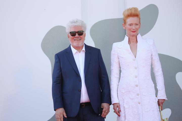 Pedro Almodóvar y Tilda Swinton en la alfombra roja del Festival de Venecia. Getty Images