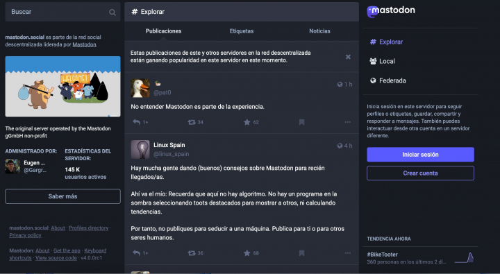 Visualmente, Mastodon y Twitter incluso se parecen. En vez de tuits, los usuarios publican toots —de hasta 500 caracteres, frente a los 280 de Twitter— que se pueden recompartir (boost), marcar como favorito o contestar y también existen los hashtag—. De nuevo, aquí los servidores, son la clave y lo que marca la diferencia.